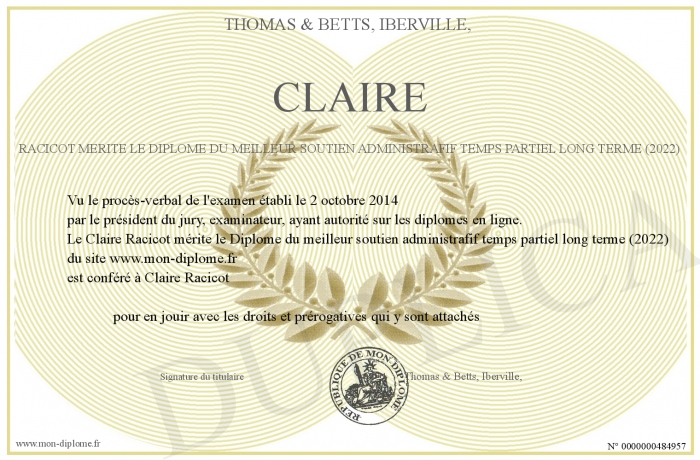 Envoyez par email votre Claire Racicot mérite le Diplome du meilleur soutien administrafif temps partiel long terme (2022) personalisé
