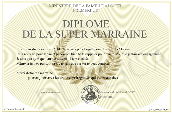 Envoyez par email votre Diplôme de la super marraine personalisé