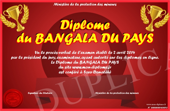Envoyez par email votre Diplôme du BANGALA DU PAYS personalisé