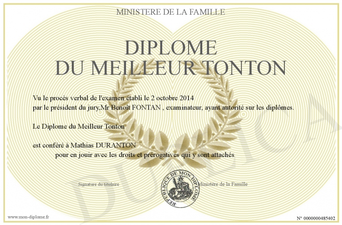 Envoyez par email votre Diplôme du Meilleur Tonton personalisé