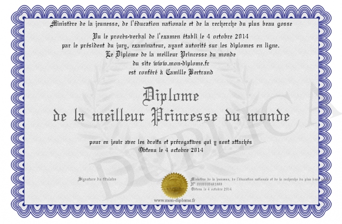 Envoyez par email votre Diplôme de la meilleur Princesse du monde personalisé