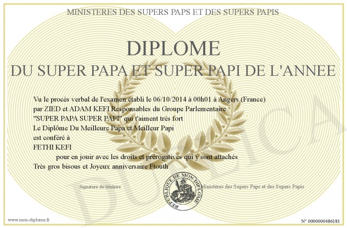Envoyez par email votre Diplôme du SUPER PAPA et SUPER PAPI de l'ANNEE personalisé