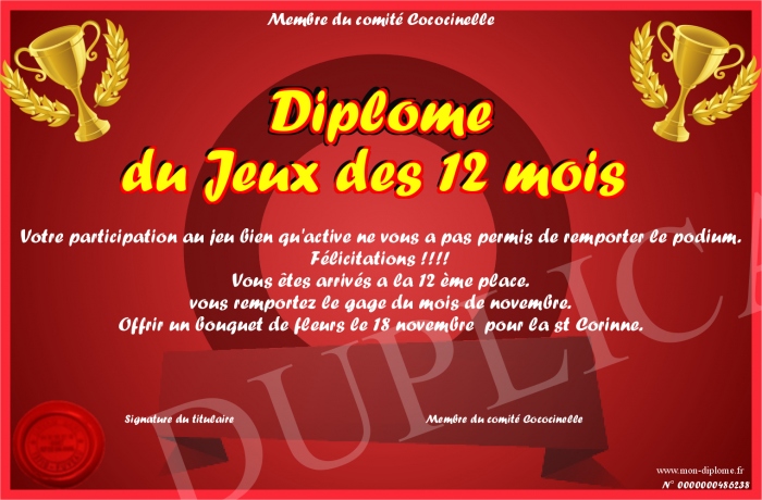 Envoyez par email votre Diplôme du Jeux des 12 mois personalisé