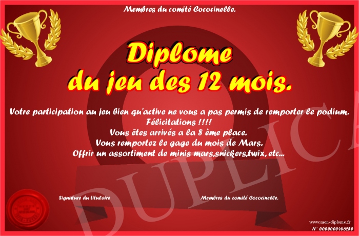 Envoyez par email votre Diplôme du jeu des 12 mois. personalisé