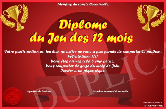 Envoyez par email votre Diplôme du Jeu des 12 mois personalisé