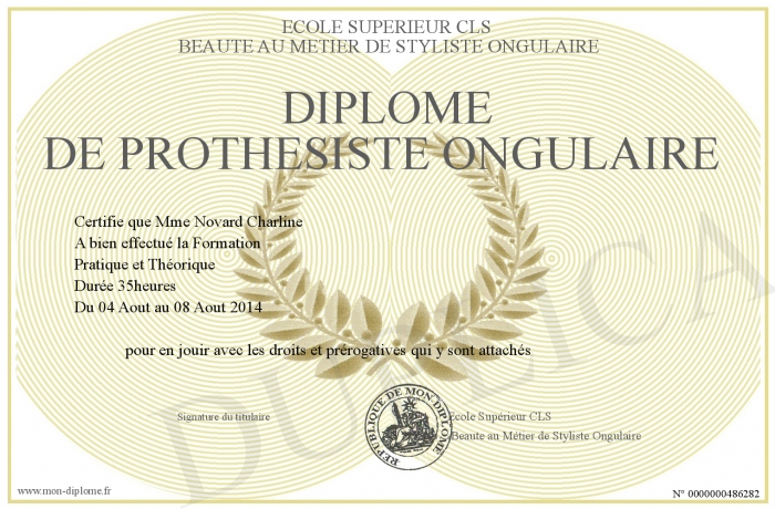 Envoyez par email votre Diplôme de Prothésiste Ongulaire personalisé