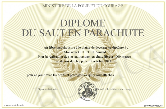 Envoyez par email votre Diplôme du saut en parachute personalisé