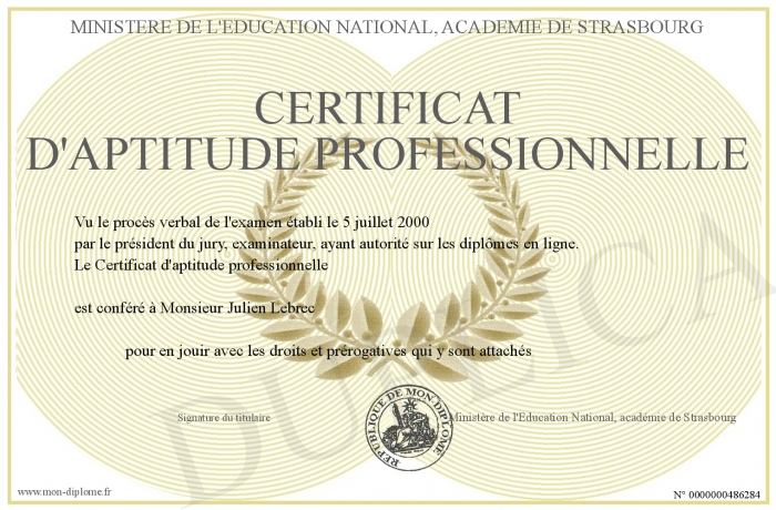 Envoyez par email votre Certificat d'aptitude professionnelle personalisé