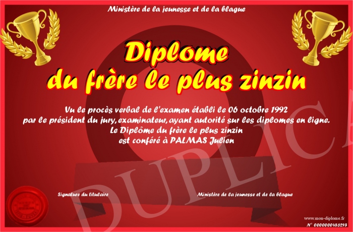 Envoyez par email votre Diplôme du frère le plus zinzin personalisé