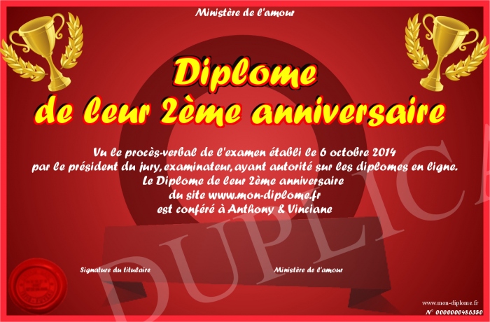 Envoyez par email votre Diplôme de leur 2ème anniversaire personalisé