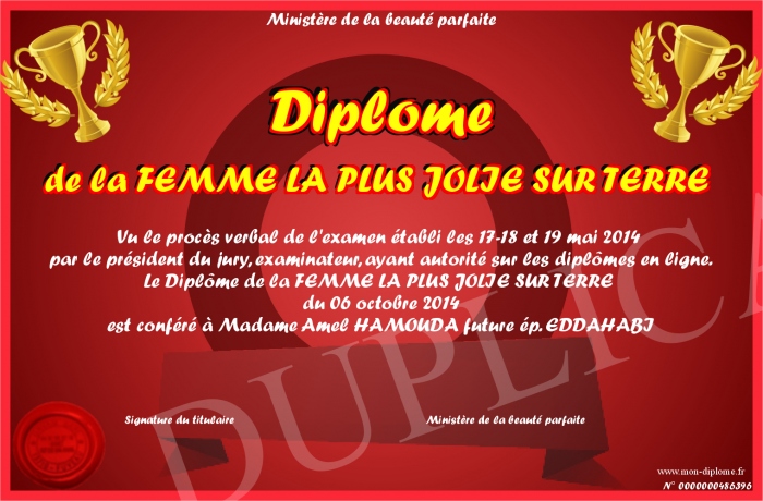 Envoyez par email votre Diplome de la FEMME LA PLUS JOLIE SUR TERRE personalisé