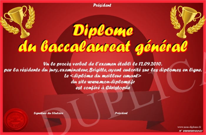 Envoyez par email votre Diplôme du baccalaureat général personalisé