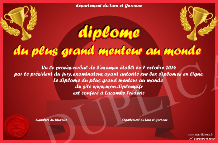 Envoyez par email votre diplôme du plus grand menteur au monde personalisé