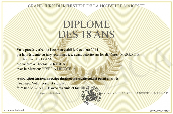 Envoyez par email votre Diplôme des 18 ANS personalisé