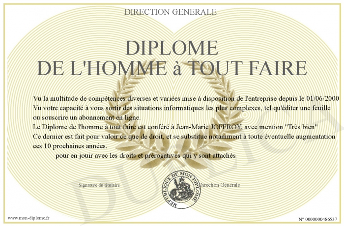 Envoyez par email votre Diplôme de l'homme à tout faire personalisé