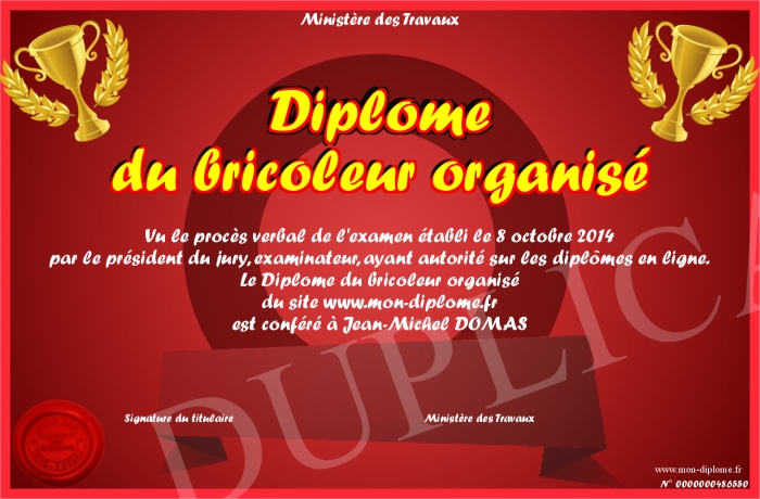 Envoyez par email votre Diplôme du bricoleur organisé personalisé