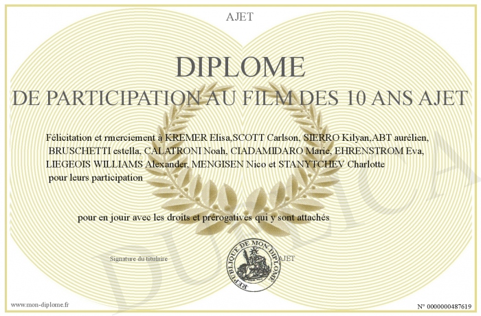 Envoyez par email votre Diplôme de participation au film des 10 ans AJET personalisé