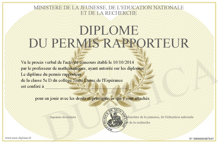 Envoyez par email votre Diplôme du PERMIS RAPPORTEUR personalisé