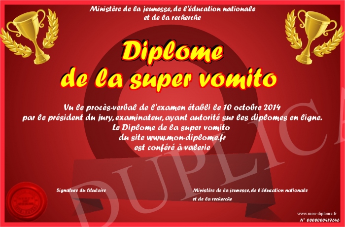 Envoyez par email votre Diplôme de la super vomito personalisé