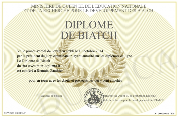 Envoyez par email votre Diplôme de Biatch personalisé