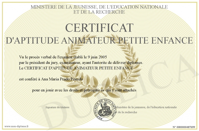 Envoyez par email votre CERTIFICAT D'APTITUDE ANIMATEUR PETITE ENFANCE personalisé