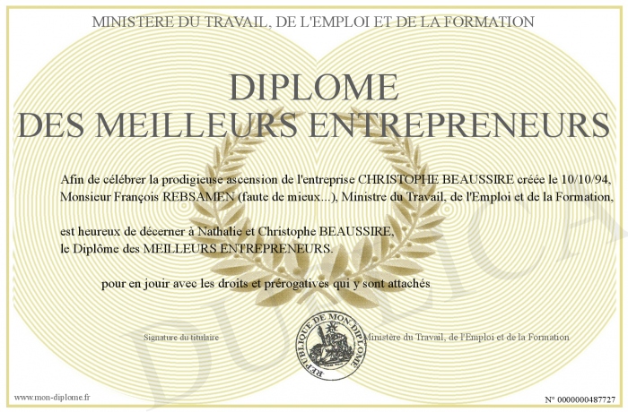 Envoyez par email votre DIPLOME DES MEILLEURS ENTREPRENEURS personalisé