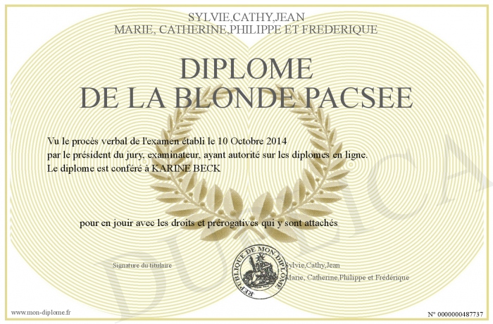 Envoyez par email votre Diplôme de la Blonde Pacsée personalisé