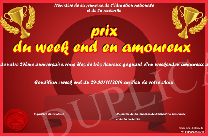 Envoyez par email votre prix du week end en amoureux personalisé