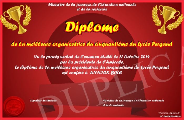 Envoyez par email votre Diplôme de la meilleure organisatrice du cinquantième du Lycée Pergaud personalisé