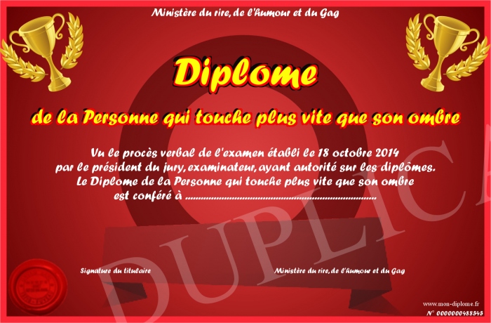 Envoyez par email votre Diplome de la Personne qui touche plus vite que son ombre personalisé
