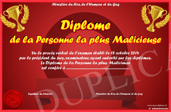 Envoyez par email votre Diplome de la Personne la plus Malicieuse personalisé