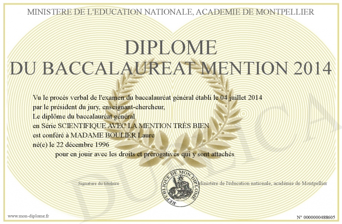 Envoyez par email votre Diplôme du baccalaureat mention 2014 personalisé