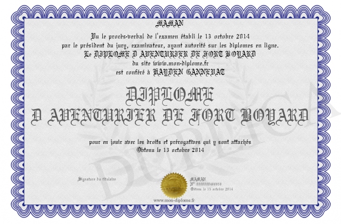 Envoyez par email votre DIPLOME D AVENTURIER DE FORT BOYARD personalisé
