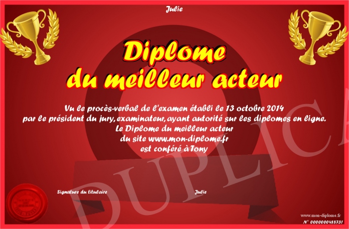 Envoyez par email votre Diplôme du meilleur acteur personalisé