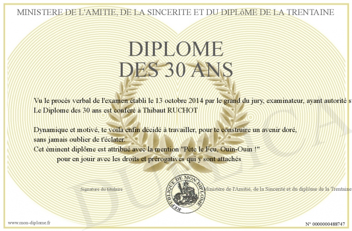 Envoyez par email votre Diplôme des 30 ans personalisé