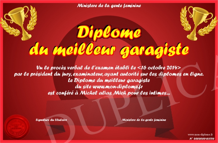 Envoyez par email votre Diplôme du meilleur garagiste personalisé