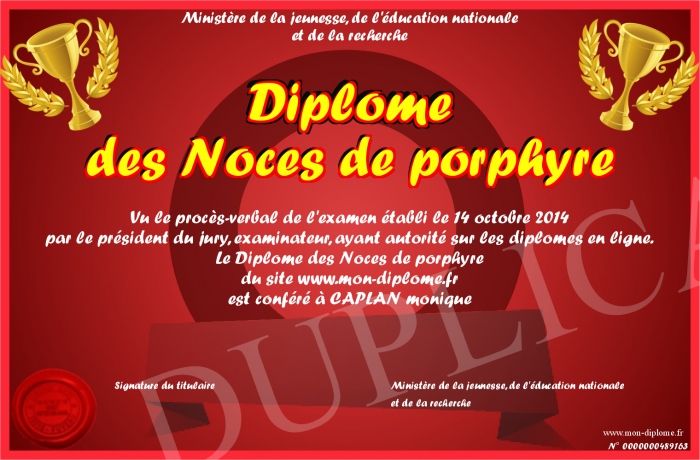Envoyez par email votre Diplôme des Noces de porphyre personalisé
