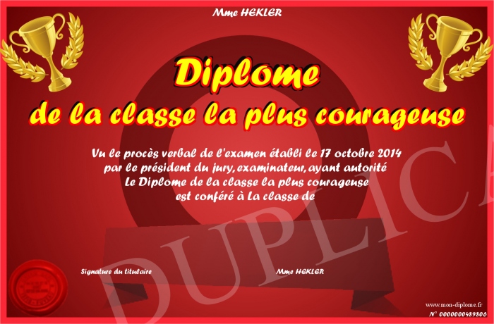 Envoyez par email votre Diplome de la classe la plus courageuse personalisé
