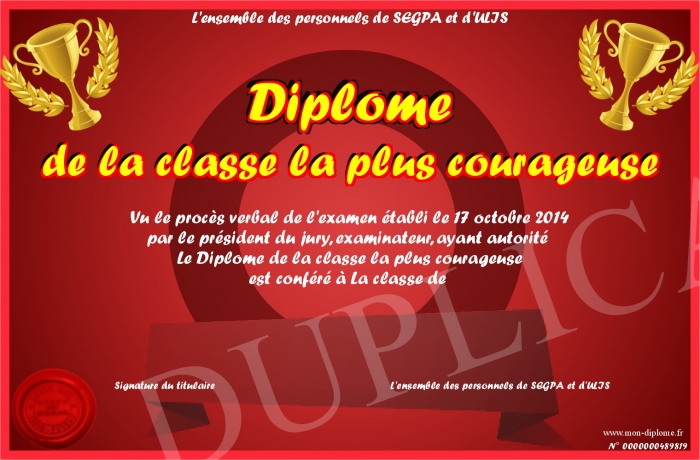 Envoyez par email votre Diplome de la classe la plus courageuse personalisé