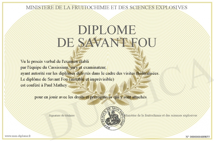 Envoyez par email votre Diplôme de Savant Fou personalisé
