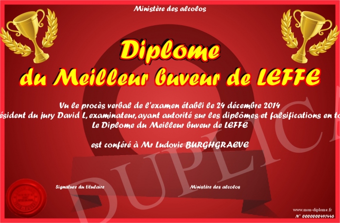 Envoyez par email votre Diplôme du Meilleur buveur de LEFFE personalisé
