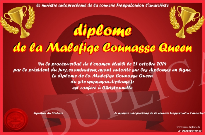 Envoyez par email votre diplôme de la Malefiqe Counasse Queen personalisé