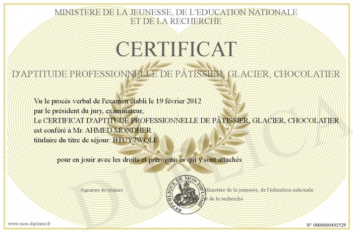 Envoyez par email votre CERTIFICAT D'APTITUDE PROFESSIONNELLE DE PÂTISSIER, GLACIER, CHOCOLATIER personalisé