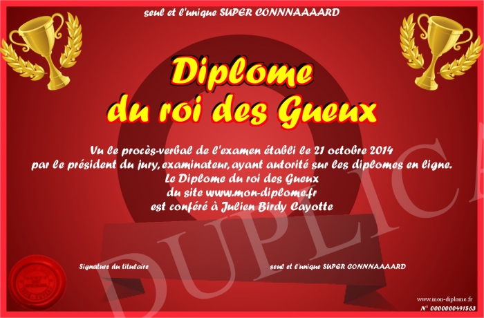 Envoyez par email votre Diplôme du roi des Gueux personalisé