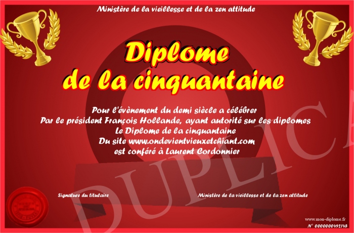 Envoyez par email votre Diplôme de la cinquantaine personalisé
