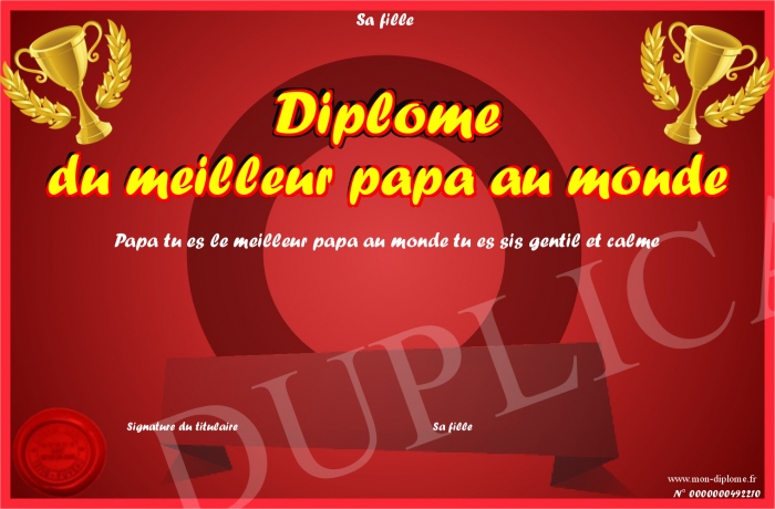 Envoyez par email votre Diplôme du meilleur papa au monde personalisé