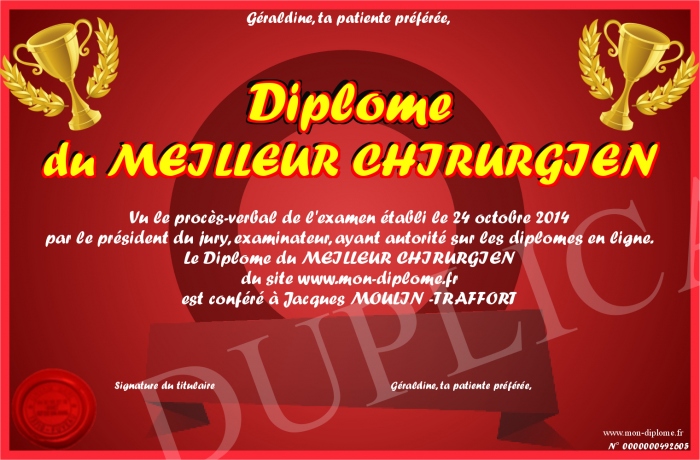 Envoyez par email votre Diplôme du MEILLEUR CHIRURGIEN personalisé