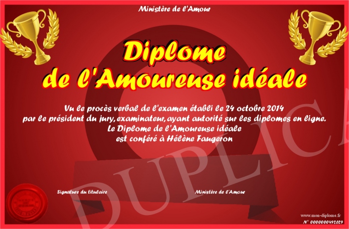Envoyez par email votre Diplôme de l'Amoureuse idéale personalisé