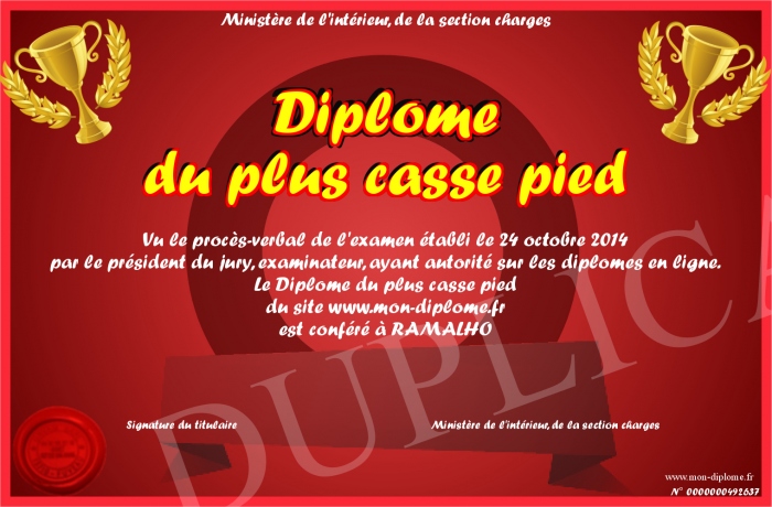 Envoyez par email votre Diplôme du plus casse pied personalisé