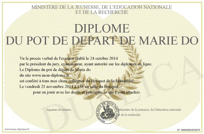 Envoyez par email votre Diplôme du pot de départ de Marie do personalisé
